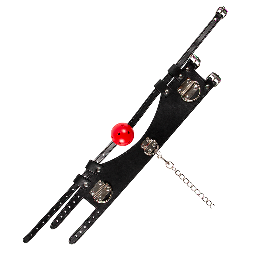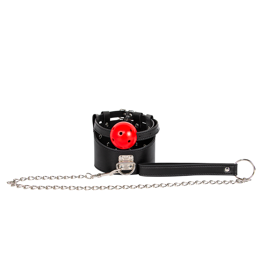 Collar de perro con cadena y extensión de ball gag para juegos fetish y prácticas BDSM.