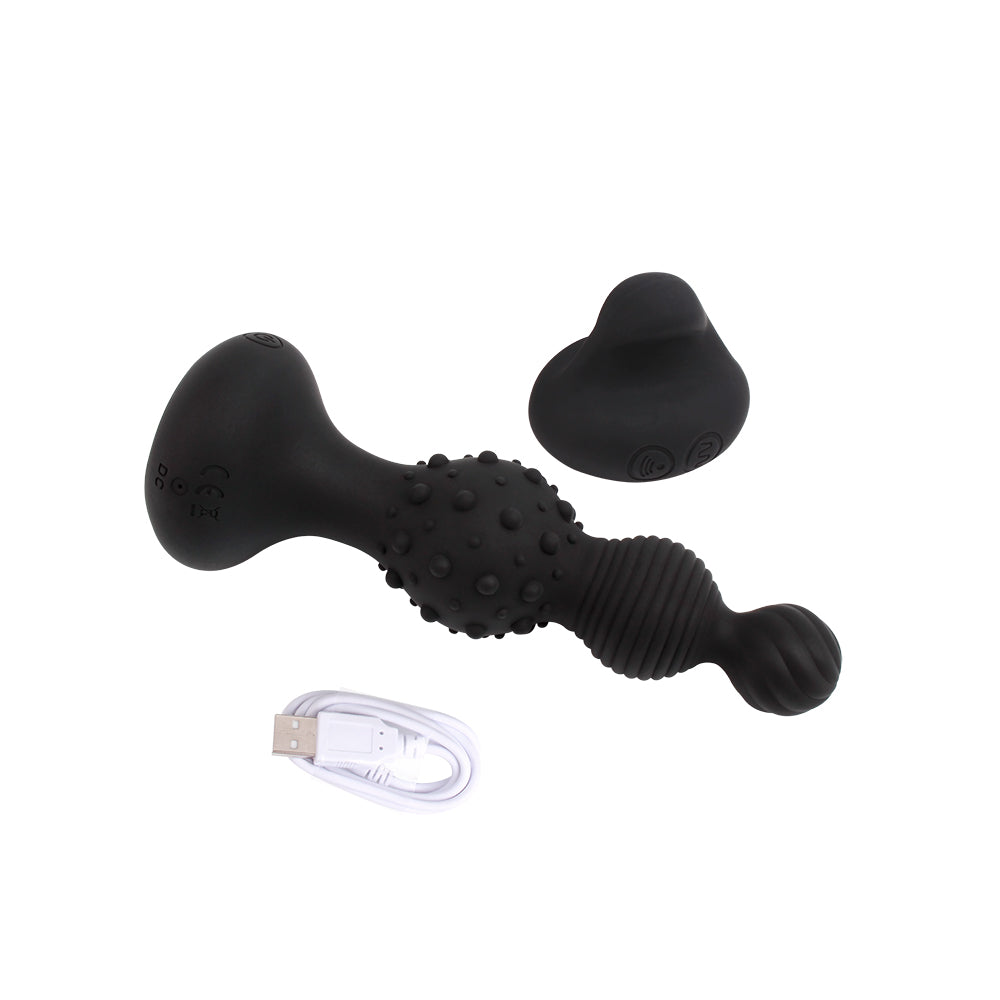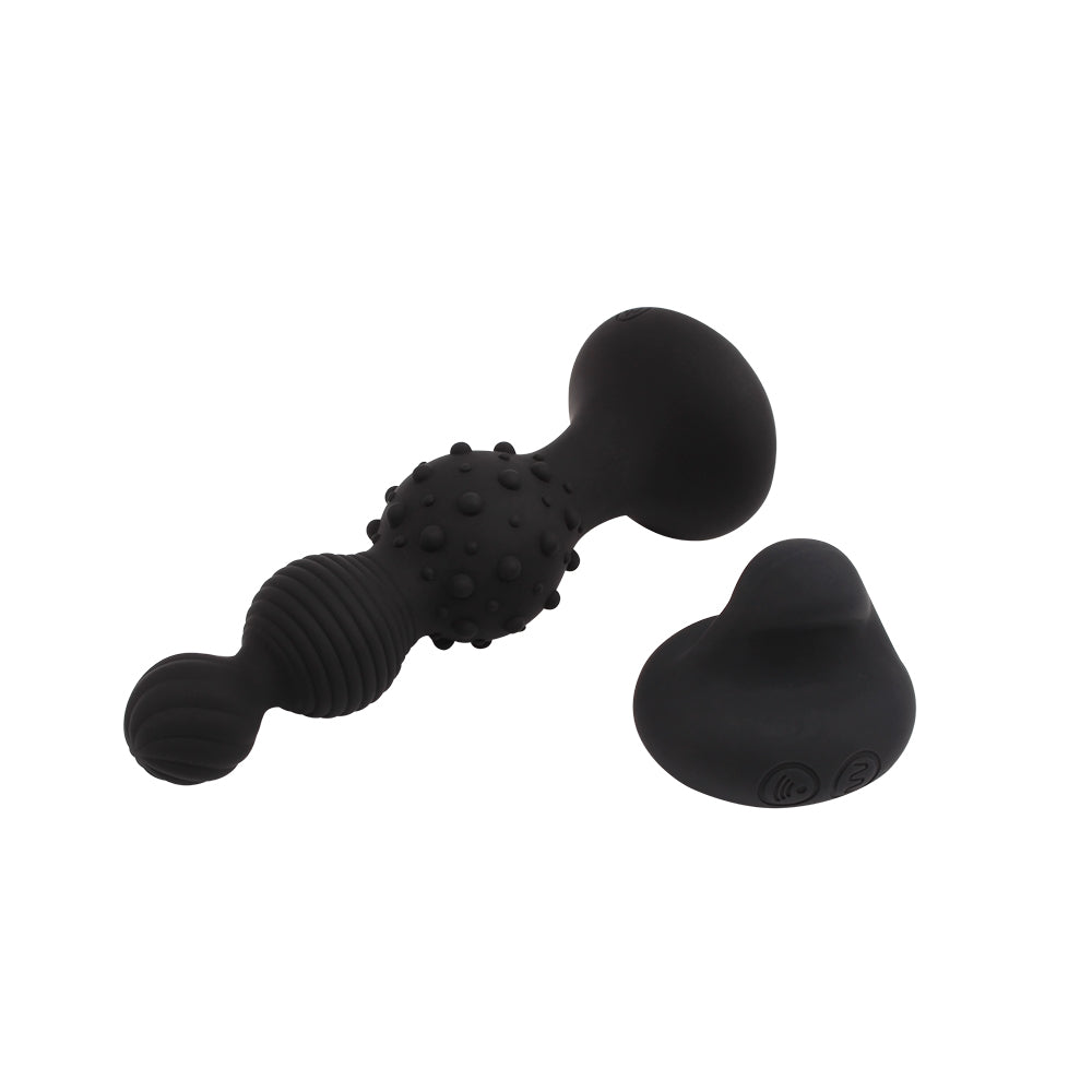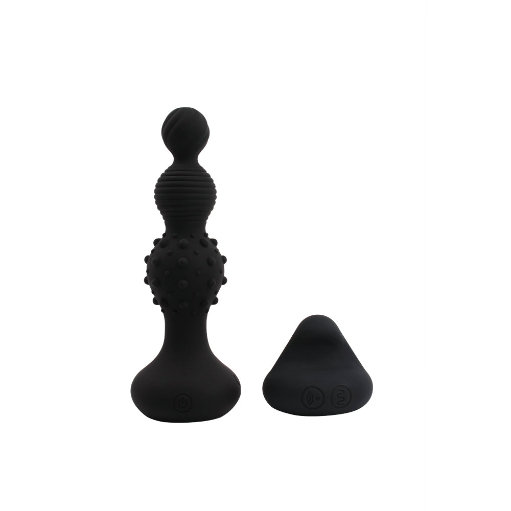 Vibrador inalámbrico a control remoto para uso anal. El juguete tiene textura con rayas horizontales y nódulos de estimulación. Las vibraciones se cambian fácilmente con un botón desde el control remoto. El vibrador puede utilizarse para estimulación anal femenina o masculina.